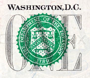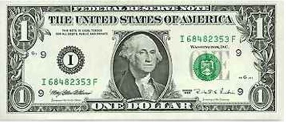 The One Dollar Bill has 2 images (authorization/ownership seals) on it - Federal Reserve (LEFT) and The Department of the Treasury (RIGHT).