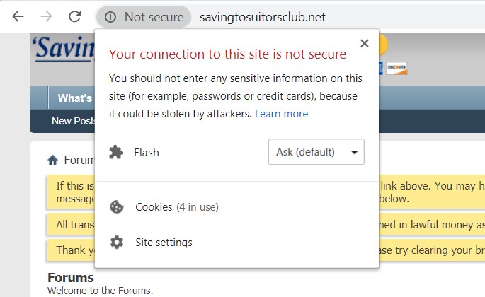 If you open a browser and enter "savingtosuitorsclub.net" you will get the non-secure version (http) of the site and see the "Not secure" notice leftside of the location box: