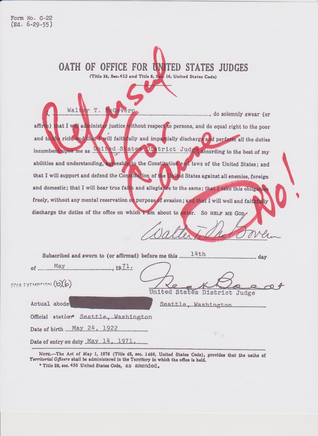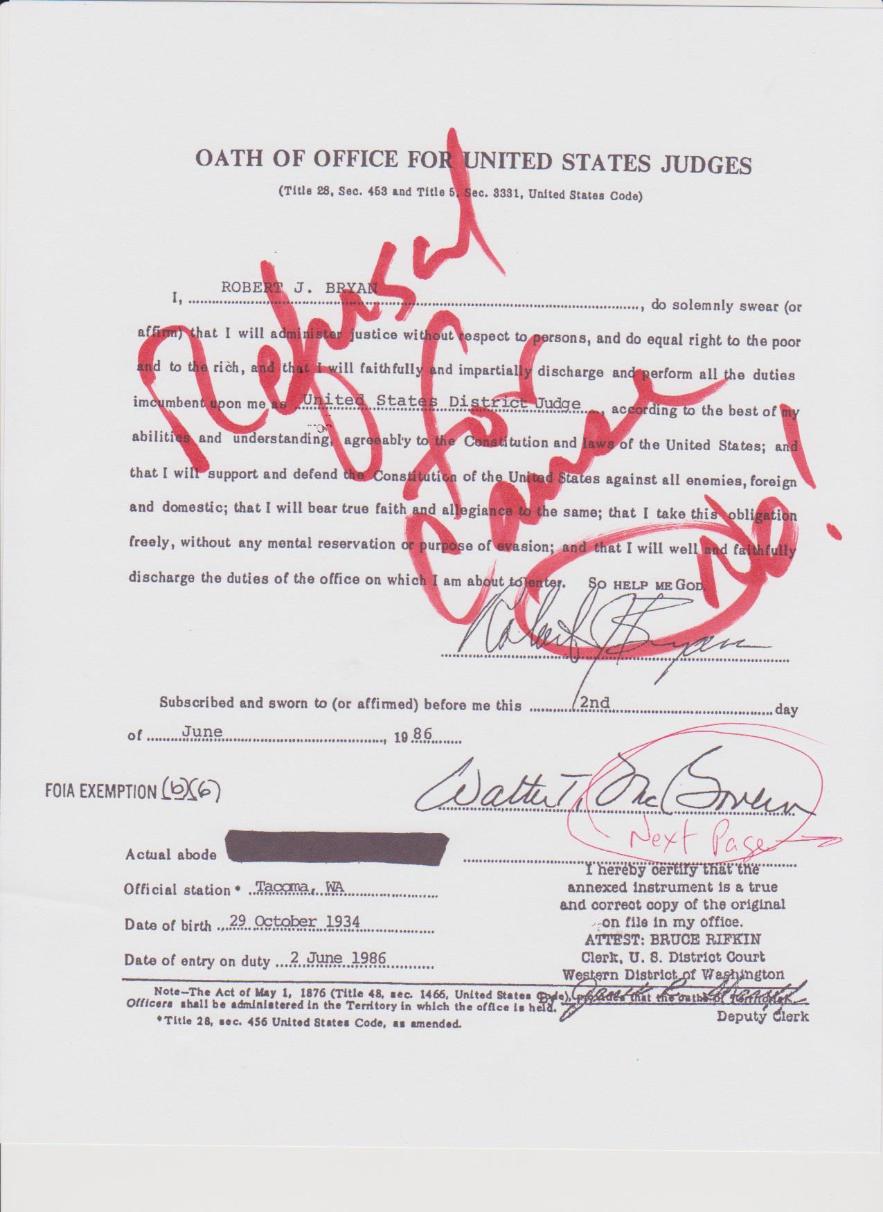 The oaths became more and more deviant from the above form of oath. But they started with the third judge on the "psychological evaluation as an arraignment tool" case. The first, the Chief Judge cancelled my $20M performance but since I showed up the bill is outstanding. The second judge recused immediately and the third, David A. GILBERT swore out a phony oath and was the one you refer too, who tried to destroy my mind. But I would not consent and kept audio recordings. I showed up at the psychologist/neurologist at the ordered time but he wanted me to sign consent forms. I told him I was there by court order, my consent was a null issue.