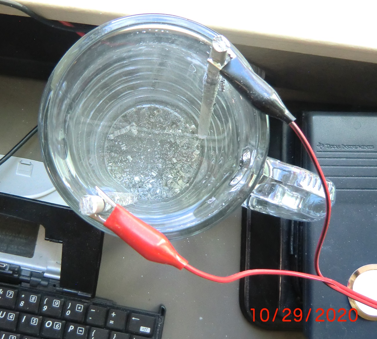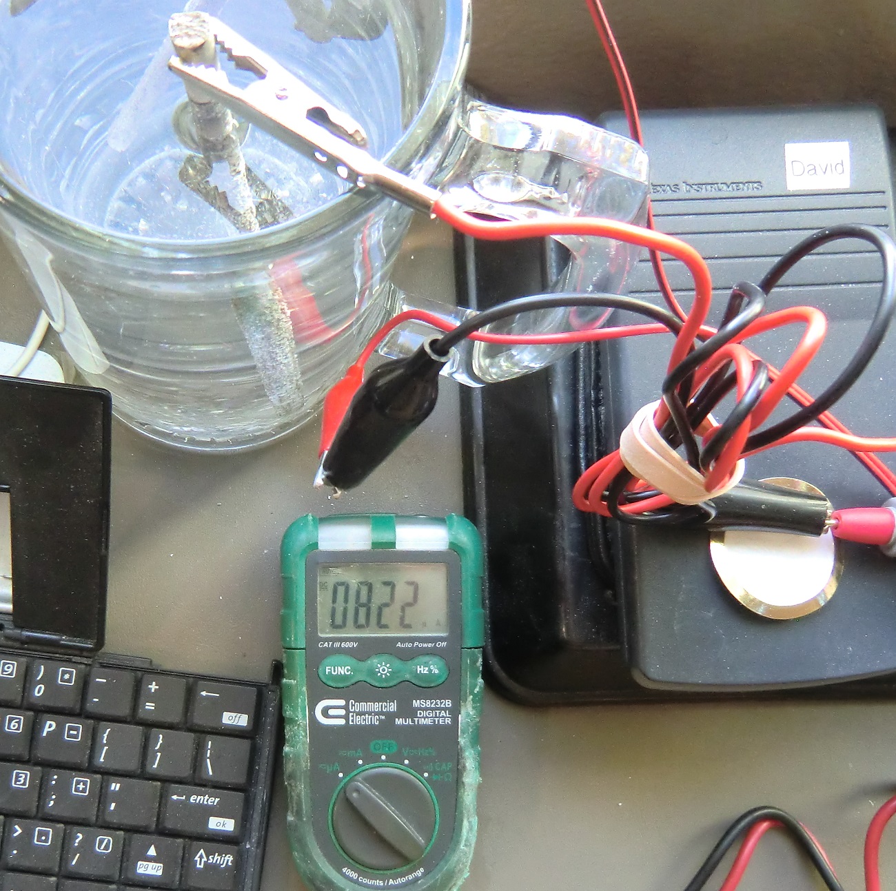 P.S. I am adding some items from my desk. What you are looking at is magnesium manna fabrication. Yesterday the current was 1.1 uA (micro ampere) and today it is .88 uA. I carefully draw from the clear center of the glass with a straw then replenish the glass with Berkey Blue filtered water. Just the same, after a while without drinking the current went down, not up. So by keeping the voltage low I pump monatomic atoms of pure magnesium into the water from the negative (black) electrode (cathode). Rust, or magnesium oxide builds up and precipitates off the positive (anode) electrode. So the ionic content would rise if I were pumping metal clusters into the water, which would happen if I passed a certain voltage - maybe 2.5V instead of the 1V.