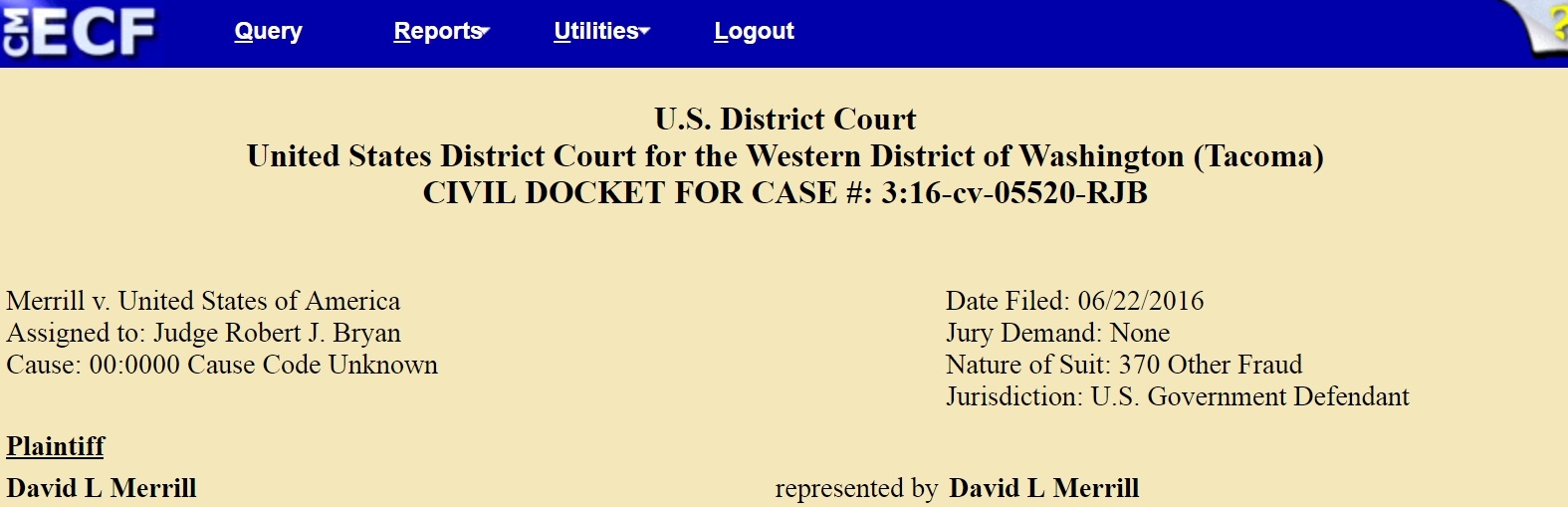 Interestingly, the clerk of court is unwilling to correct the name on the case from bankruptcy attorney David L. MERRILL to David Merrill.