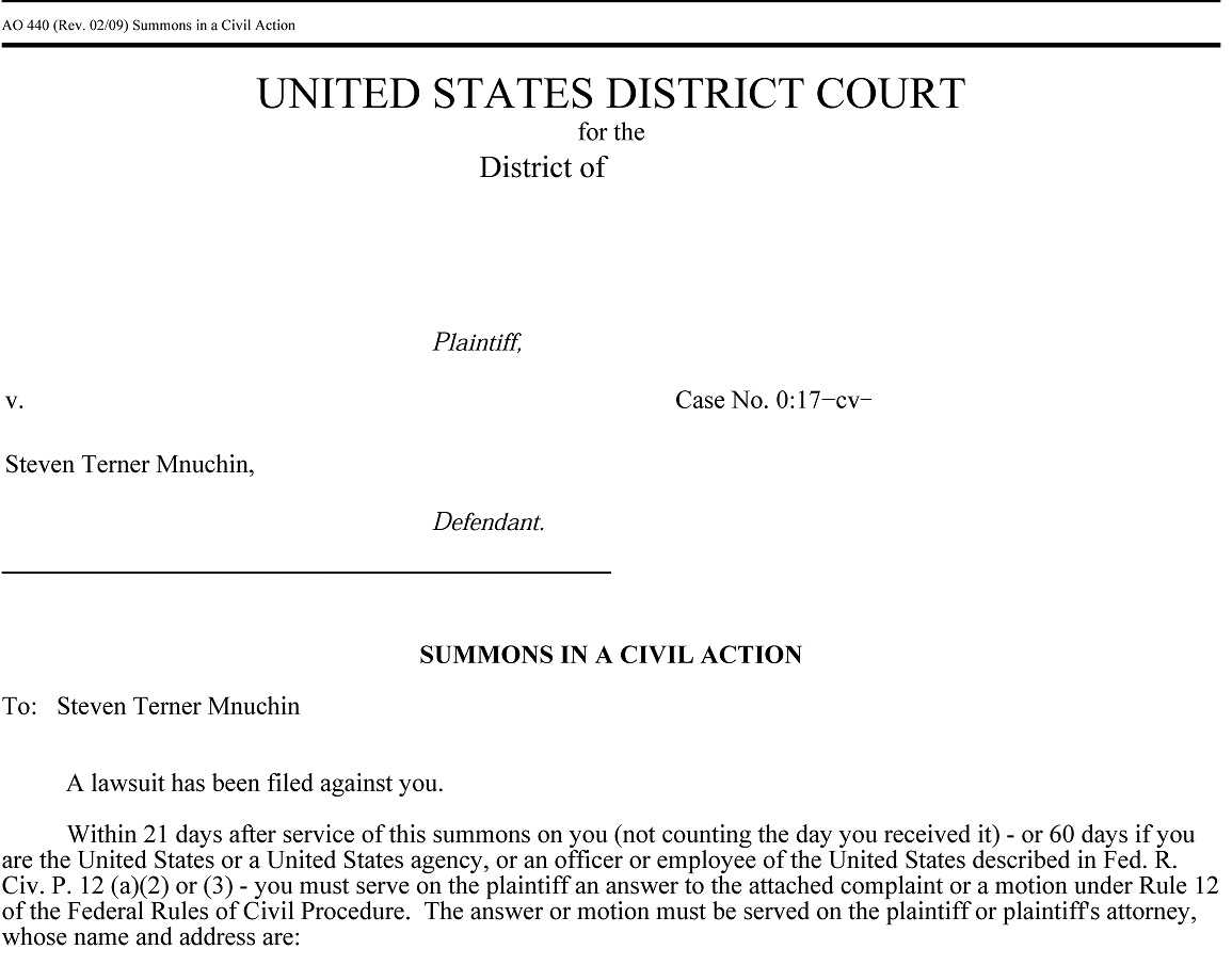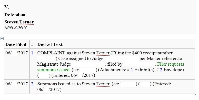 This particular case demonstrates Steven Terner MNUCHIN, the Secretary of the Treasury reverting to True Name, as US Governor of the IMF. It took a week to enter it on PACER and over the weekend yet to actually appear on PACER. This Certificate of Mailing revealed that PACER-marked copies would be mailed after they appeared on PACER. This suitor, for good reason does not like to go in the federal courthouse. Especially since the last thing on his 2009 evidence repository is the clerk returning his "Notice and Demand for Lawful Money" in 2013. Some suitors have good reason to put no trust in the unbound "judiciary".