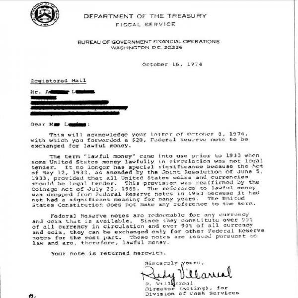 I love letters like this. David hits it on the head with saying this is sophistry. If you ask me the letter makes the term 'lawful' an adjective for money. The code 12usc411 seems to use it as a noun 'lawful money' like it is a thing. I guess we go back to what CLINTON said, "it depends what the definition of is, is." But at the end of the day the note carries the term legal tender. Maybe anyone more familiar in the UCC can answer this. Since it is legal tender can I refuse it for a debt (that someone owes me) and still retain my claim to it because of that refusal? The reason I ask is that the coin that was just made legal tender in UTAH does not have to be accepted. I thought that went for all legal tender.Originally posted by David Merrill View PostTo me, we find the monetizing of sin (debt). There are no FRNs extant that did not arise from a loan.