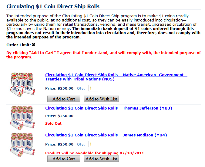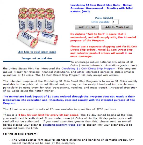 The immediate bank deposit of $1 Coins ordered through this Program does not result in their introduction into circulation and, therefore, does not comply with the intended purpose of the Program.Last edited by allodial; 07-03-11, 07:44 PM.All rights reserved. Without prejudice. No liability assumed. No value assured.