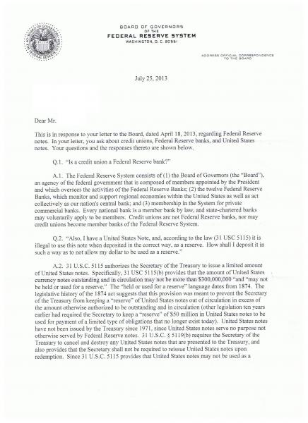 The best part of the letter is the admission, and the extant belief/understanding by the FED, that U.S. notes (redeemed lawful money) are NOT to be used as a reserve - U.S. notes are inelastic currency.