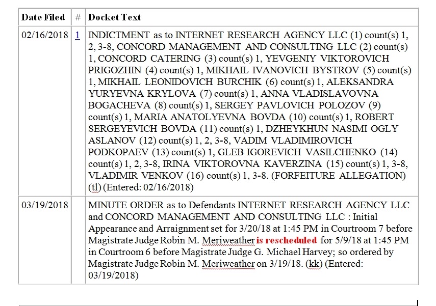 Boy, talk about indicting a ham sandwich. On February 16, 2018 special counsel Robert Mueller indicted Concord Management along with two other corporate entities and 13 Russian nationals allegedly connected to the Internet Research Agency (Case 1:18-cr-00032). February 19, 2018 David Merrill sends Amicus Curiae to the court recusing Daniel L. FRIEDRICK for having a deviant oath of office. Because Russians cannot be extradited to the US it seemed highly unlikely the indictment would result in a trial. But Concord unexpectedly hired American law firm Reed Smith and appeared. The prosecution seemed befuddled and tried to say defendant wasn't properly served. Judge said doesn't matter, they're here. At some point the judge becomes Dabney L. FRIEDRICH (transgender?).