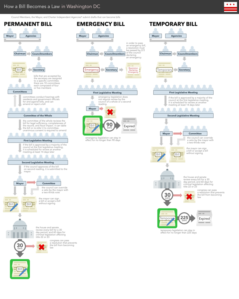 Note the easy-overlooked and poignant factor of pre-DC and pre-USA municipalities being brought into the District. My off-the-cuff and rough analysis at this time is that #1 Those cities were freed from state constitutional confines. #2 Those cities were originally independent meant they were made 'homerule' in the district. #3 That Washington county, Georgetown and city of Washington were merged, the incorporation of a county (in a sense orphaned by Maryland) made the entire electorate presumed incorporated. #4 That it took a special act in 1895 to fully merge Georgetown is telling. The flag might suggest that DC got its power from Georgetown (a colonial municipality), city of Washington and county of Washington.Under the U.S. Constitution, the District remains under the jurisdiction of Congress. However, at various times in the city's history, Congress has devolved some of its authority to District residents and their elected representatives. The possible paths of bills, emergencies, and temporaries through the power structure of Washington, DC as dictated by the Home Rule act.