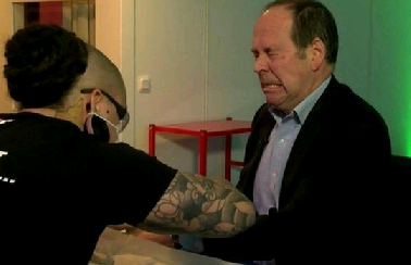 Left photo: NBC's Kerr Simmons after going through a rite of telepossession tries it out. Rightmost photo: Rory Cellan-Jones, BBC Technology correspondent gets telepossessed (look at the guy doing it!).