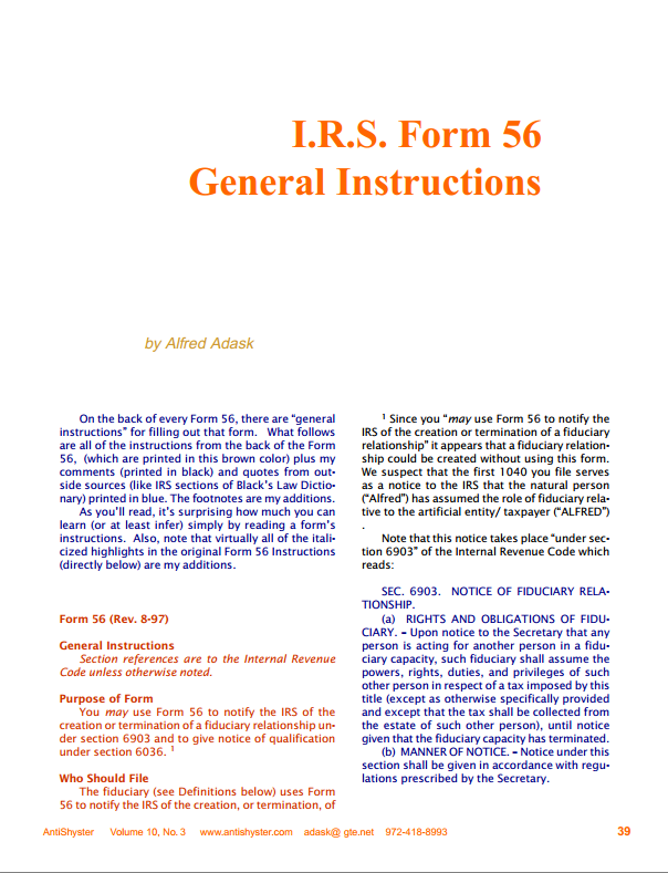 This is an article about a 'magical' IRS Form 56. It might be worth noting that IRS Form 56 deals with fiduciary relationships, its like a notice of ownership and not all that different from a fictitious name registration or a vehicle registration (relationship between owner and thing owned identified or specified).