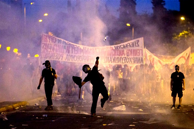 An anti-austerity protester throws a bottle at riot police in Athens, Wednesday, July 15, 2015. Greece's prime minister was fighting to keep his government intact in the face of outrage over an austerity bill that parliament passed on Thursday.