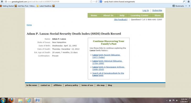 I have come across other information such as the non-existence of the house/parcel where his mom allegedly lived and lack of any Lanza's owning property in Fairfield County, Connecticut but this might be of interest to some: