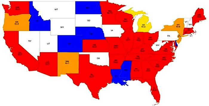 Researchers are finding that head lice that are becoming resistant to OTC treatments. Red states: 100 percent of the tested lice were resistant. Orange states: 50 to 90 percent of lice were resistant. Yellow states: 1 percent to 49 percent were resistant. Blue states: Data hasn't been analyzed yet. White states haven't been tested.