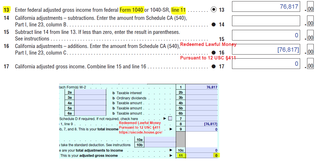 In your federal Form-1040 filing example, it could be problematic to subtract the entire gross pay [76817] as redeemed lawful money (assuming this is a W-2 employee). For the simple fact the employee would not have the full $76817 in checks to redeem. At a minimum, deductions for Medicare & Social Security would be withheld from the paycheck before the worker could make a demand.