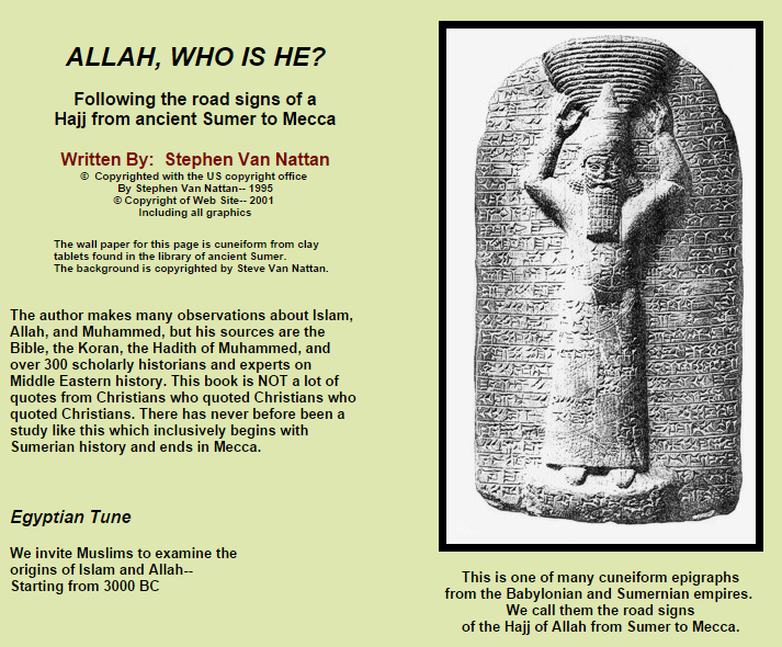 Allah, Who Is He? is the title of a work by Stephen Van Nattan. Instead of dabbling with the idea of Allah being a "Moon god", Van Nattan points at historical and archeological evidence pointing at Allah' association with solar or phallic deities and evidences a historic link from ancient Sumer to Mecca. Of course he may have his own political or other slants, its about getting to the heart of historical record about Islam or "Allah" and whether or not there is any relationship between the God of the Old Testament and Allah as some might suggest. Its interesting and perhaps no surprise that Cyrus Scofield was among those who have asserted Allah to be the same God as that of the Bible.