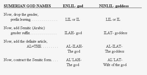 To say the heritage of Allah goes back to Il and Ilah, and thence to the moon deity is a total falsehood, but it sure helps in the development of the argument in Islamic Invasion. The heritage of Allah goes straight back to Enlil, the solar deity right after the Tower of Babel. Enlil was solar, and his consort, Ninlil, was the moon deity. Thereafter, many permutations of the things evolved, but the "lil" in Enlil is the virtual origin of the Ilah in Al-Ilah, which is contracted to Al'lah.