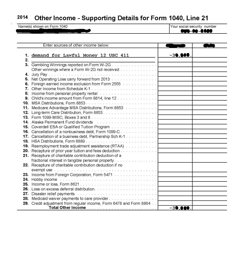 At the end of the section you get to Other Income - Miscellaneous and it's here you enter total redeemed Lawful Money for the year, as a negative amount. A simple total of LM amounts/checks either cashed or deposited. But once again, no more LM than was listed on income lines above. In the description I put: Demand for Lawful Money 12 USC 411. This will create a page titled Other Income - Supporting Details for Form 1040, Line 21 for you to file, like this ...