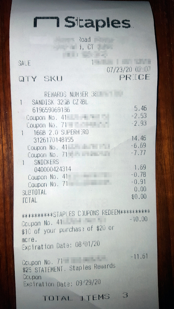 I offered a $10 off $20 coupon, and the 11.61 balance was paid with something called STAPLES REWARDS. A kind of store-dollars or store-currency that had accumulated to $25.