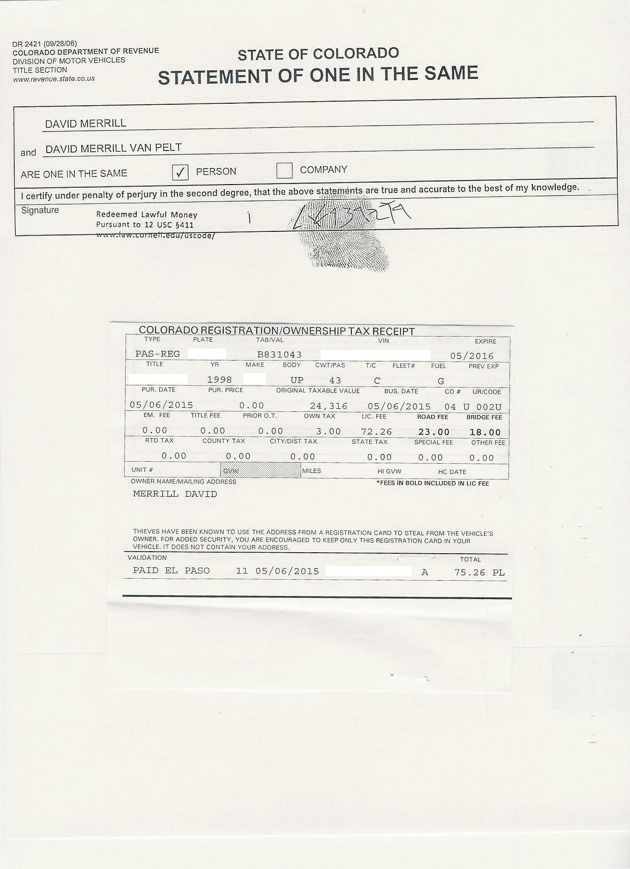 So by the posts above I feel that there is a much different take on identification. Start by considering I have exposed a criminal syndicalism of judiciary that evades bonding; therefore there is no authority other than by force for the Department of Revenue to prosecute me for perjury. In last week's Complaint to the chief justice at the Tenth Circuit Court of Original Jurisdiction (not Appeals) for example I wish I had snapped a photo of the full page Oath that I Refused for Cause. Until Tim signs a proper bond, with the Secretary of State for a witness the whole complaint goes nowhere, because he is part of the fraud.